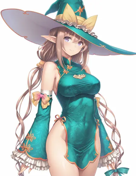 (提示词):1girl, solo, 长发, 紫色眼睛, 极长发, 棕色头发, 侧发, 钻头发, 低绑长发, 低双马尾, 发圈, 橙色发圈, 发带, 水蓝色发带, 尖耳, 精灵,