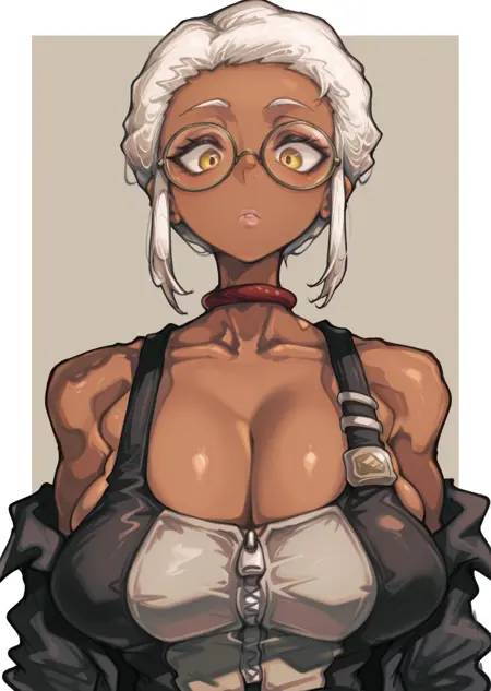 プロンプト: semiu、濃い肌、白い髪、黄色い目、丸メガネ、赤いチョーカー、ジッパー付きタンクトップ、