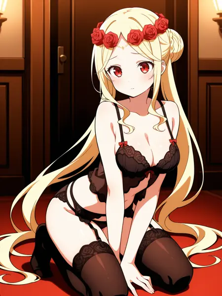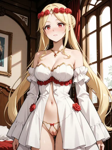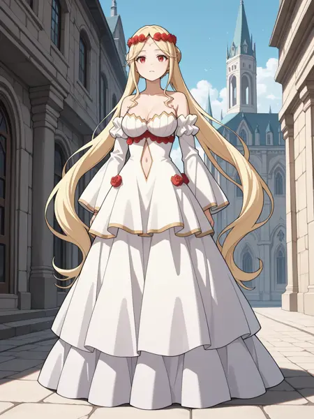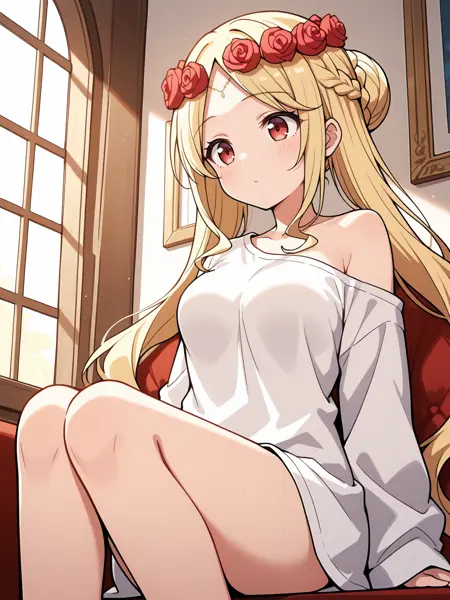 외모: 원본, 금발, 매우 긴 머리, 머리 뾰족, 땋은 머리, 붉은 눈, 중간 크기의 가슴, 장미 머리 화환, 이마 체인