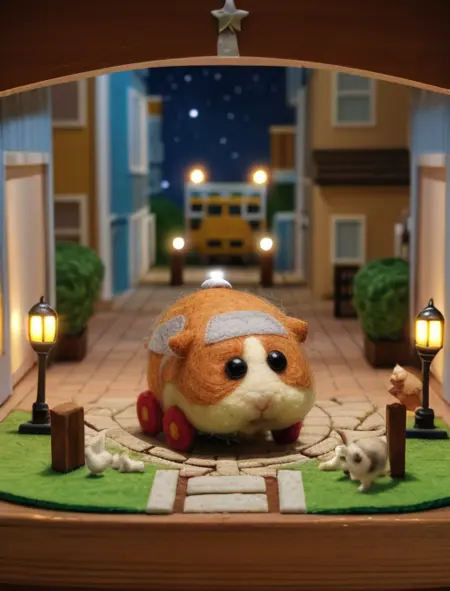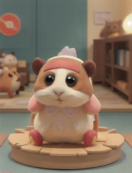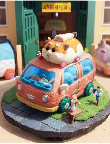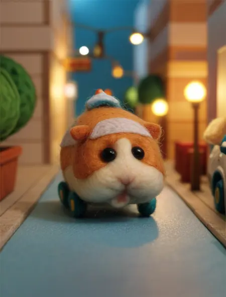 Additional words that may help: miniature, diorama, toy, felt hamster,