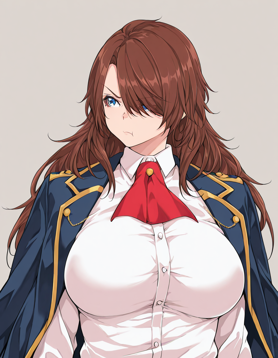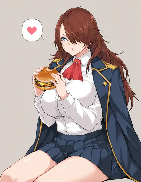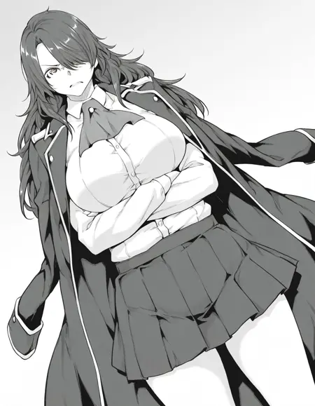 학습 프롬프트: 1girl, takigamirei, reichan, 긴 머리, 한쪽 눈을 가리는 앞머리, 큰 가슴, 어깨에 외투, 교복, 애스콧