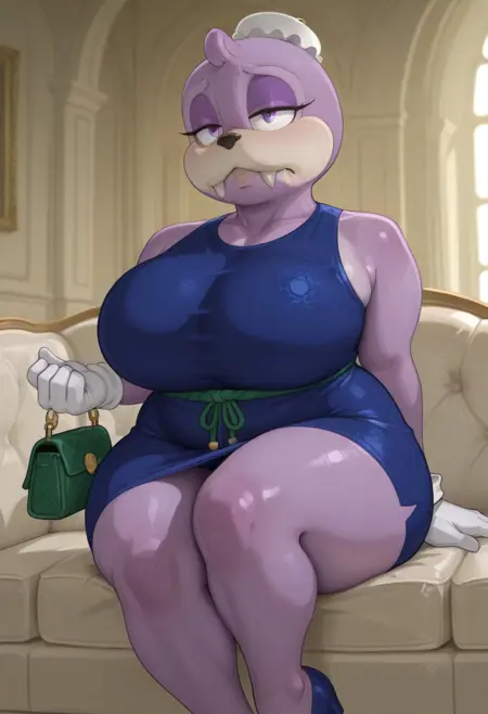 Lady Walrus, fat, purple skin, purple eyes, tusks, small white hat, long blue sleeveless dress, green belt, white gloves, blue heels