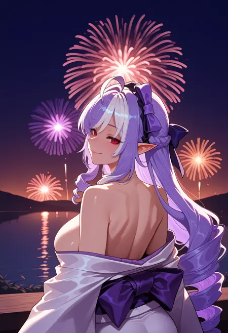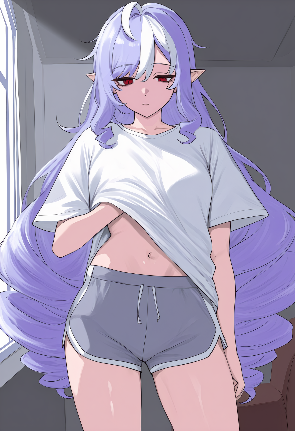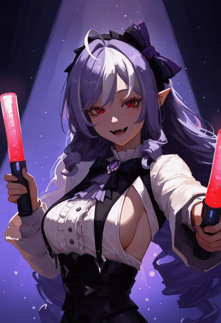 Default Outfit: mole under eye, very long hair, multicolored hair, purple hair, white hair, ahoge, drill hair, black hairband, hair bow, purple bow, pointy ears, red eyes, white shirt, center frills, black bowtie, brooch, purple gemstone, purple ascot, sideboob, long sleeves, frilled sleeves, black corset, layered skirt, black skirt, white skirt, pleated skirt, brown pantyhose, black nails