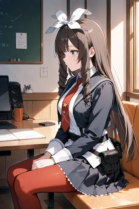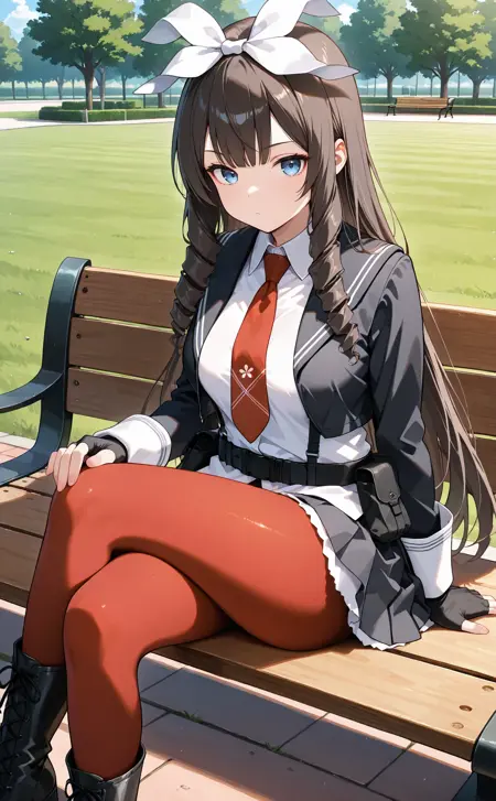 有用提示词:黑发,长发,钻头发型,双钻头,白色发带,蓝眼睛,刘海,夹克,白色衬衫,黑色百褶裙,红色领带,有领衬衫,红色连裤袜,