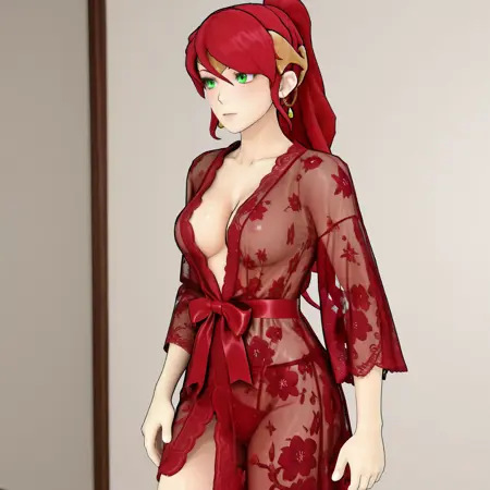 触发词:Pyrrha, 1girl, 红发, 绿眼, 额饰, 肘套, 颈甲, 长发, 护甲, 裙子, 臂环, 腿甲, 中等胸部, 裸露肩膀, 腰带, 挺胸, 马尾, 牛仔构图, 3D