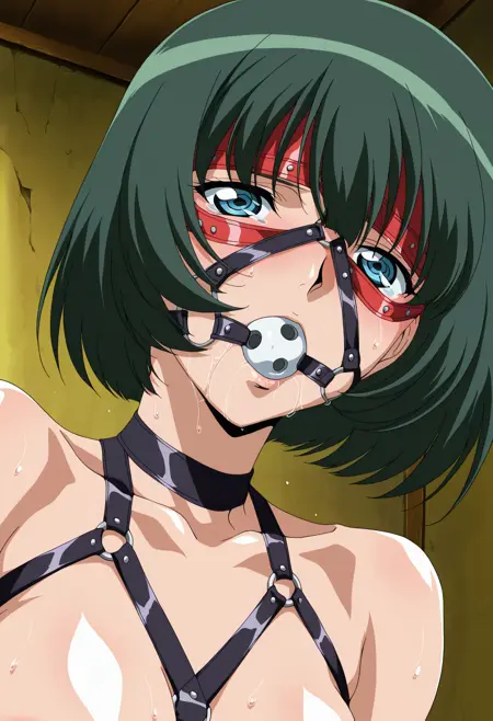 束缚装:wakaba_d,1girl,动漫着色,复古艺术风格,单人,短发,绿发,头发遮住眼睛,遮住眼睛,wakaba 眼罩,封嘴,球形口塞,威夫尔口塞,wakaba 束缚装,大乳房,