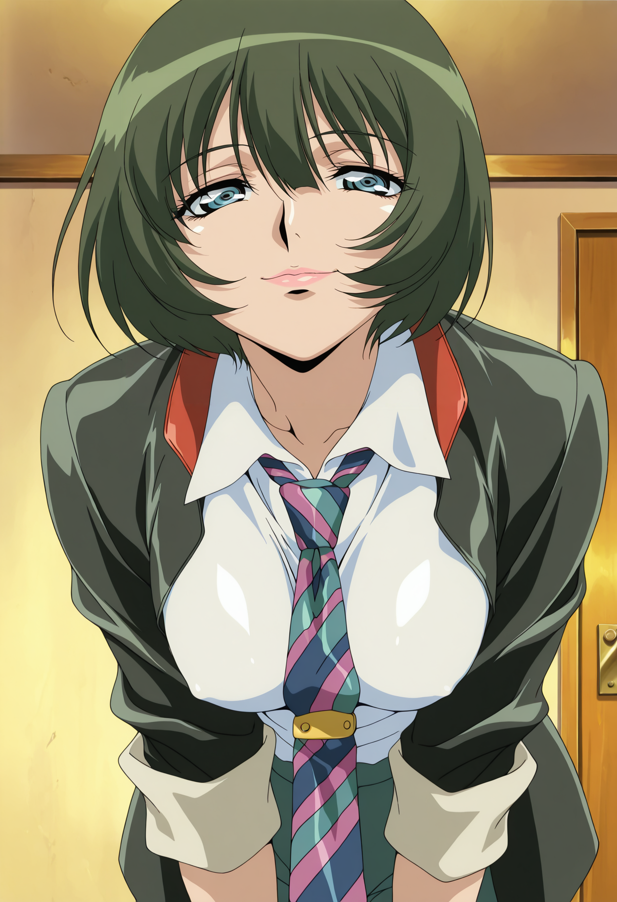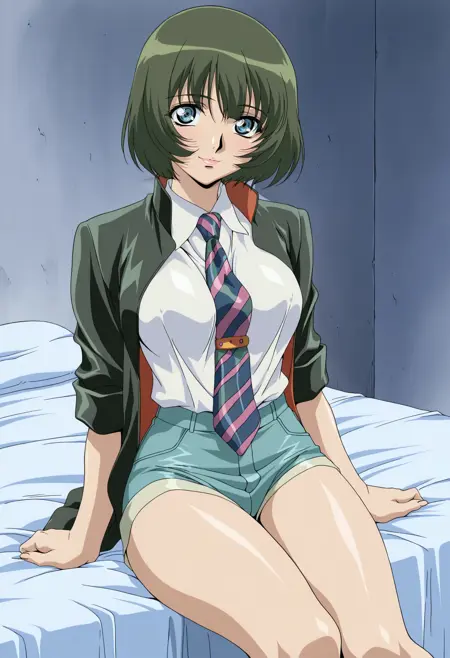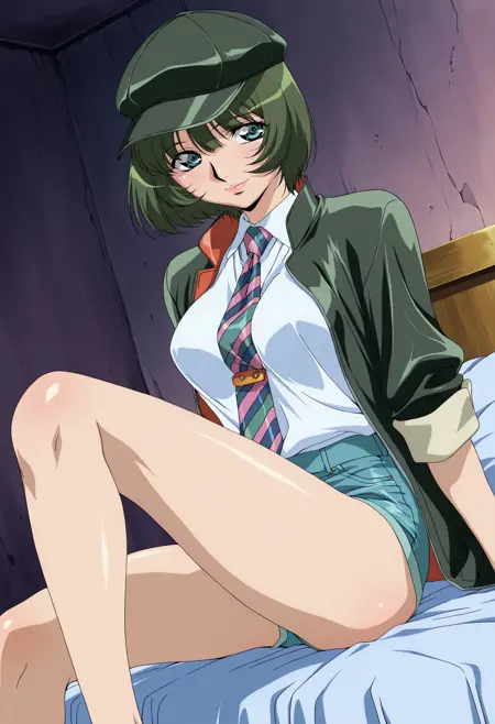 基础:wakaba_d,1girl,动漫着色,复古艺术风格,单人,短发,绿发,头发遮住眼睛,蓝眼,嘴唇,口红,出租车帽,wakaba 绿色夹克,条纹领带,袖子卷起,蓝色短裤,超短裤,