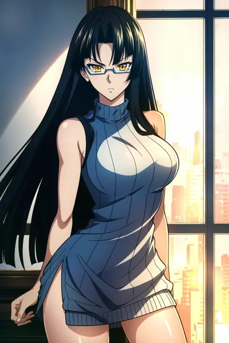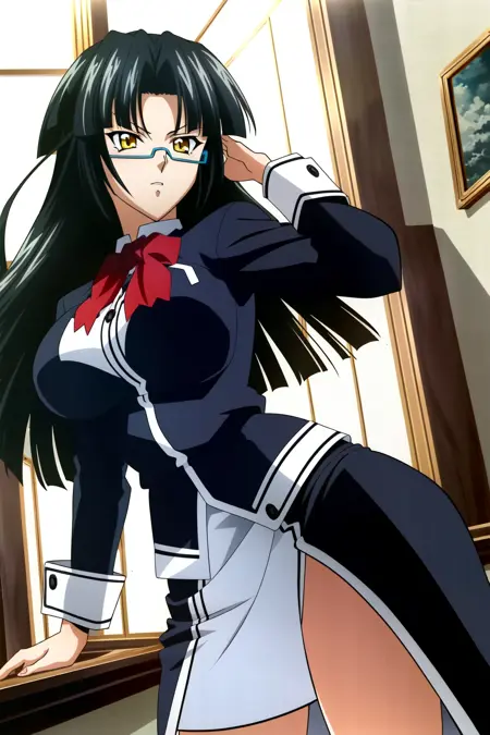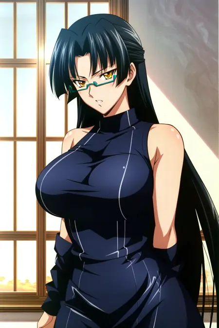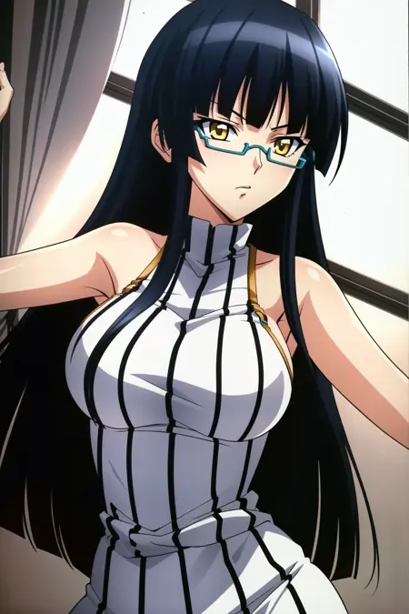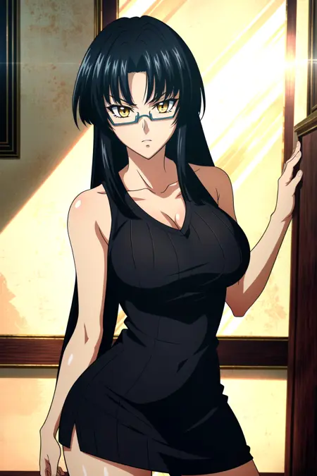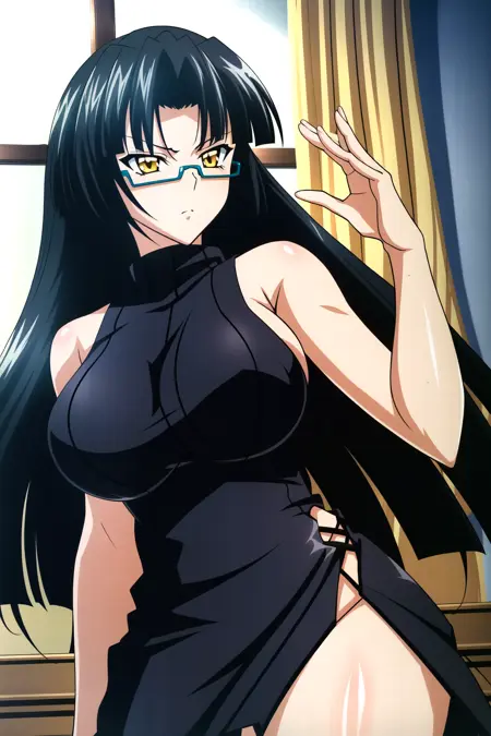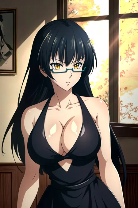 Tsubaki Shinra, glasses, long hair, yellow eyes, breasts, semi-rimless eyewear, under-rim eyewear, black hair, cleavage, large breasts