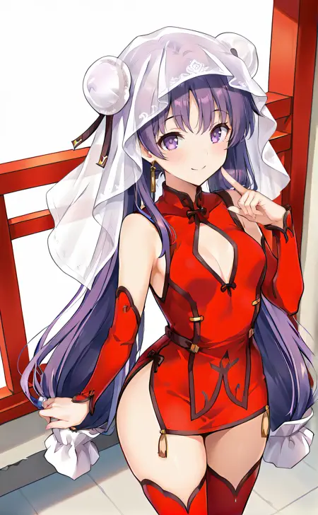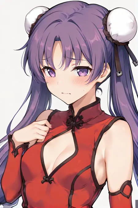 leixin, purple hair, very long hair, twintails, double bun, purple eyes, small breasts, china dress, cleavage cutout, red detached sleeves, red thigh boots