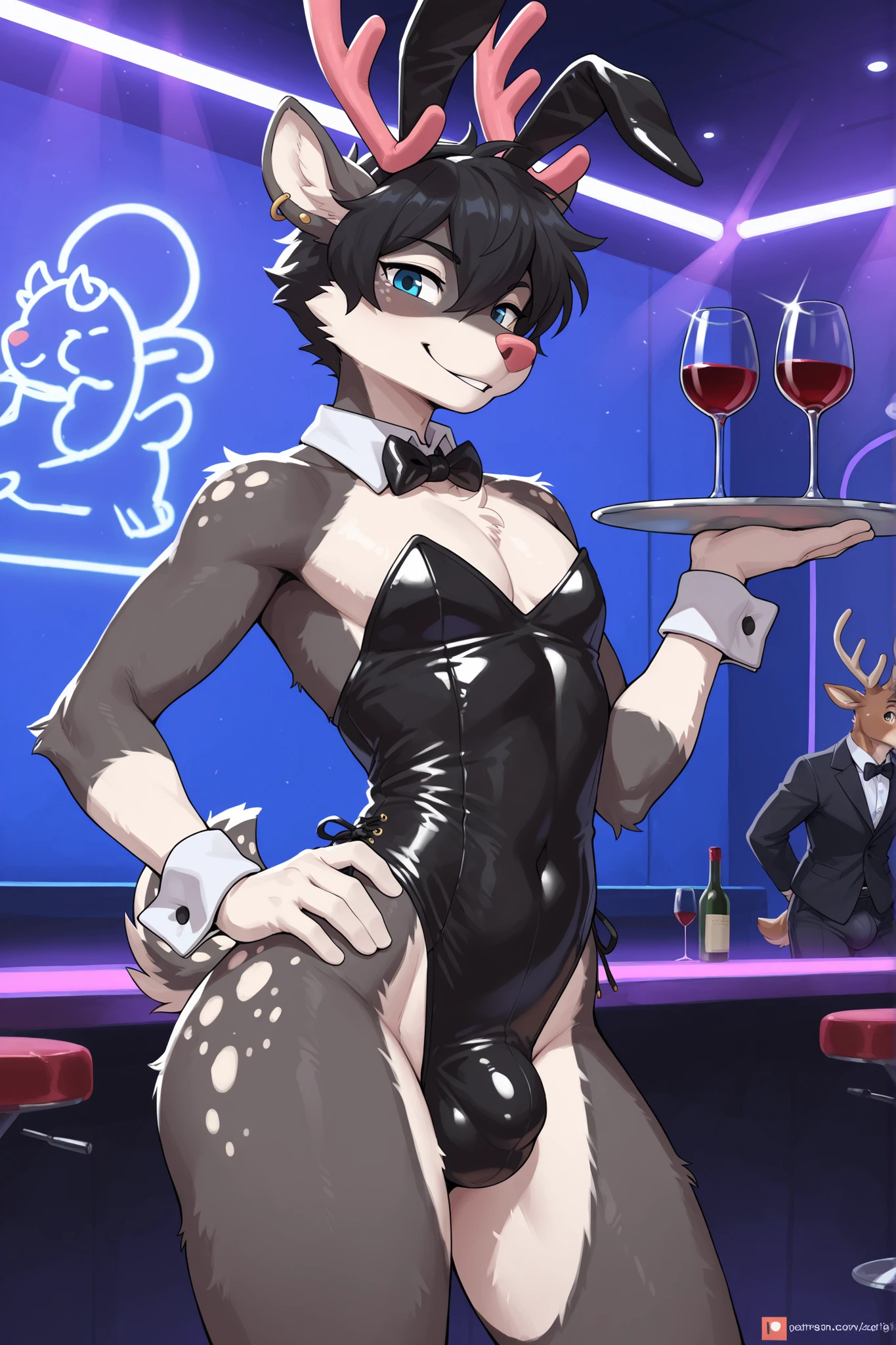 cervine, deer, new world deer, reindeer, furry, anthro, aki, white fur, grey fur, two tone fur, black hair, blue eyes, antlers, hooves, short tail, ear piercing, male, 1boy, femboy