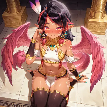 纹身, 裸露肩膀, 臂环, 多色翅膀, 露肩束胸衣, 玛雅服饰, 颈环, 金色镶边, 过膝长筒袜, 黑色过膝长筒袜, 脚链, 水蓝色指甲