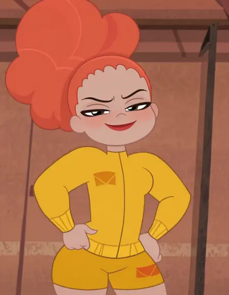 - doriszeul, brown eyes, lipstick, orange hair, streaked hair, puffy hair, puffy ponytail, yellow jacket, long sleeves, yellow tracksuit, yellow bike shorts, white sneakers
