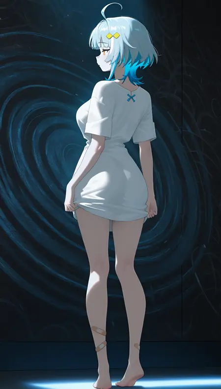 하얀 셔츠, 짧은 소매, 맨발, 하얀 드레스, 반창고, 병원 복, 노란 머리 장식,