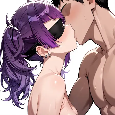 purple hair,purple eyes,diagonal bangs,blunt bangs,twintails,medium breasts,