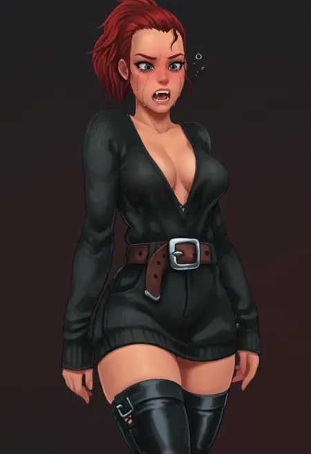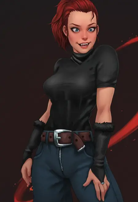 belt buckle, black sweater, jeans, red-tinted eyewear, red hair