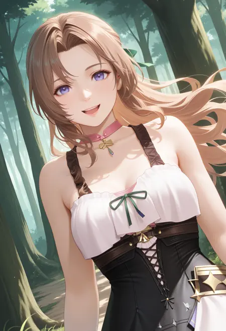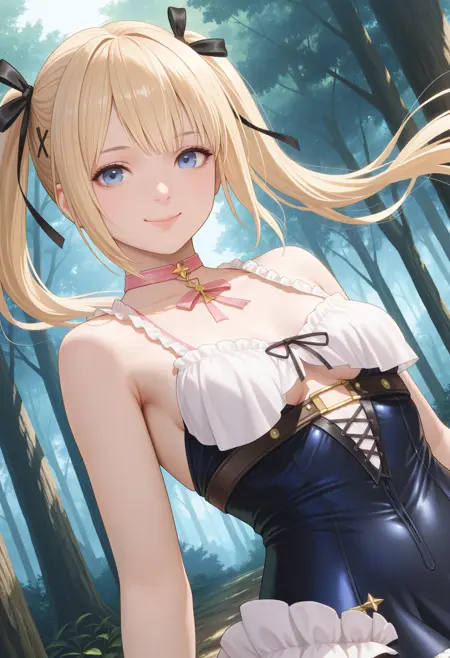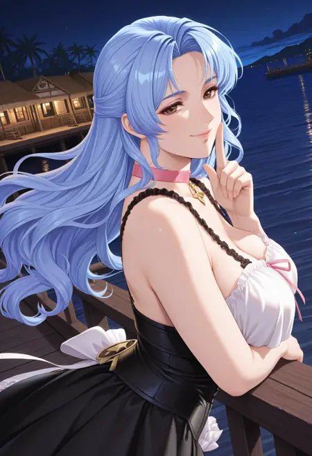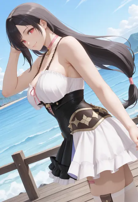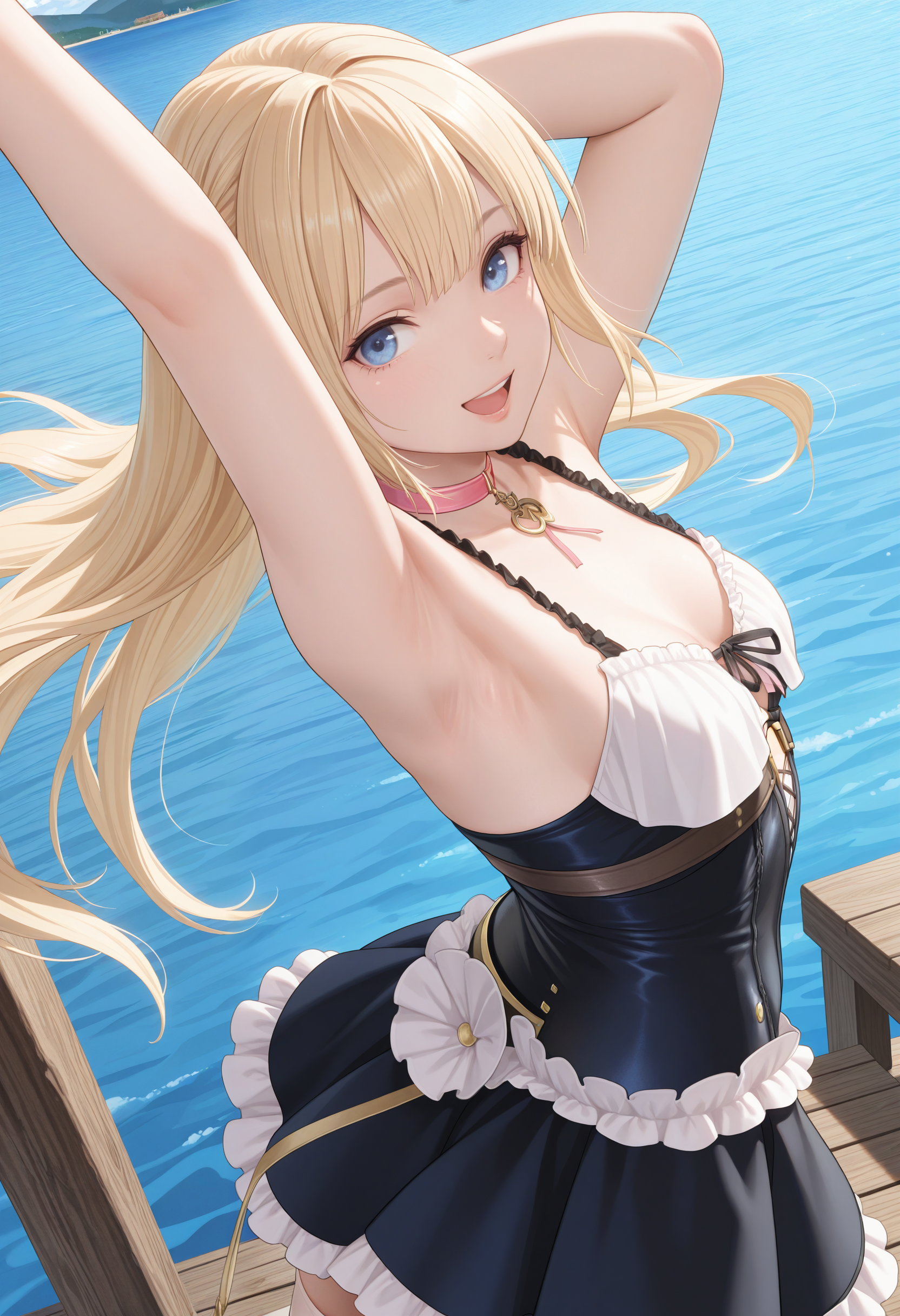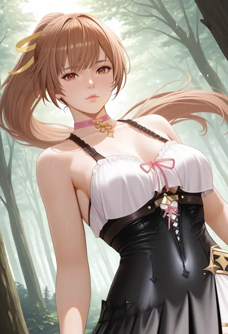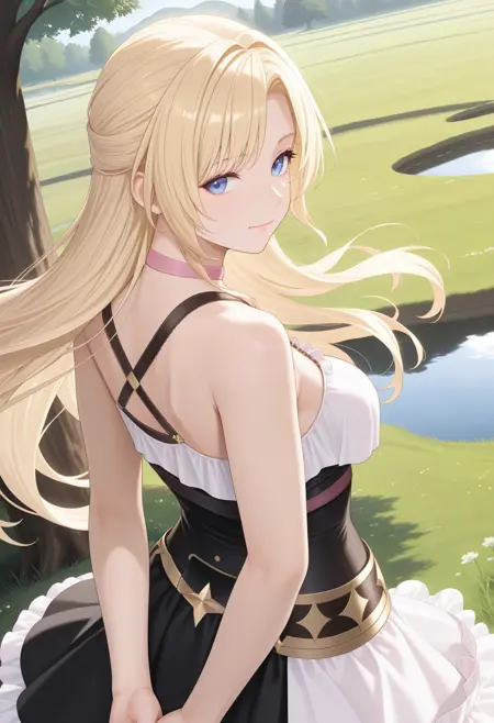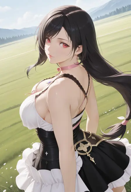 基本プロンプト:"ResnaDoaxvv1,pink choker,sleeveless dress,black dress,corset,white frilled hem,white thighhighs"