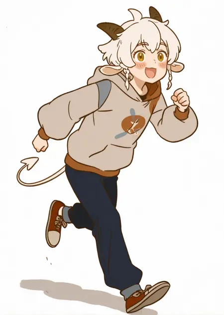 尼尔:nini-nini,solo,goat horns,goat ears,blush,white hair,tail,demon tail,hood down,blue pants,two-tone hoodie,red footwear,white hoodie,puffy sleeves,