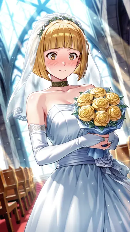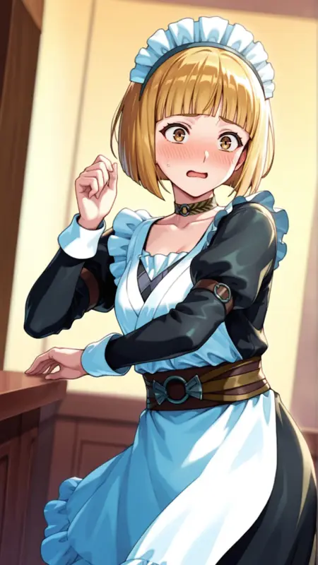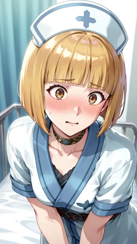 Appearance:short hair, bob cut, blonde hair, brown eyes, blunt bangs,