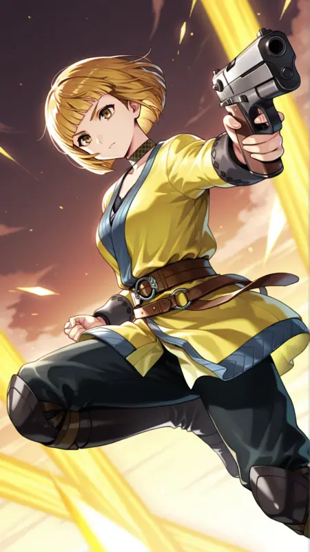 Outfit:choker, long sleeves, black pants, yellow jacket, brown belt,black knee boots,