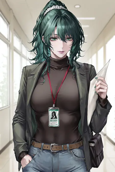 녹색 머리카락, 매우 긴 머리카락, 물결 모양의 머리카락, 중간 갈라진 앞머리, 녹색 눈, 보라색 입술, 보라색 아이섀도우, 메이크업,