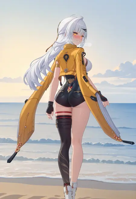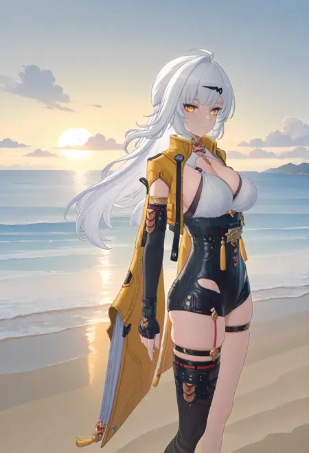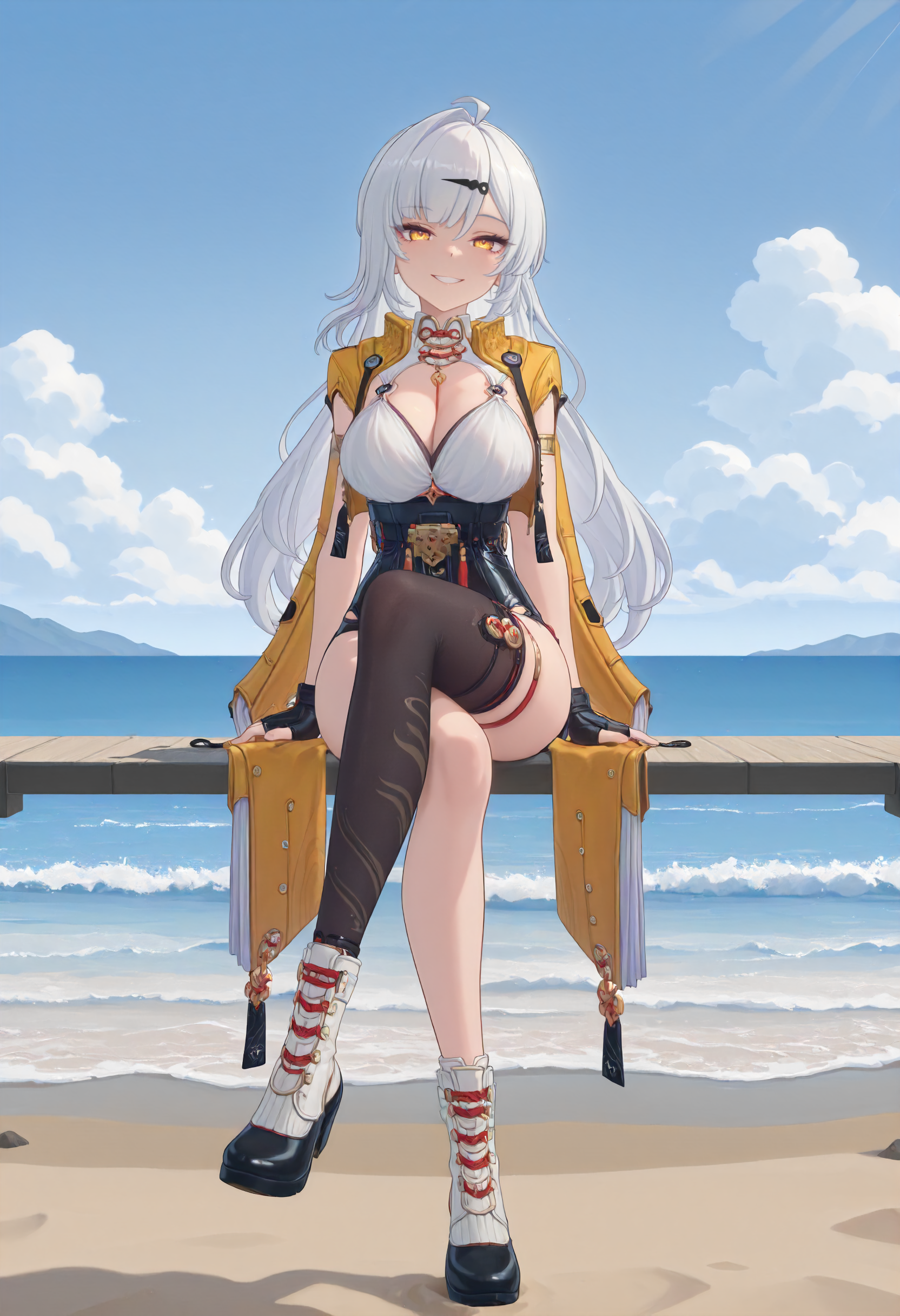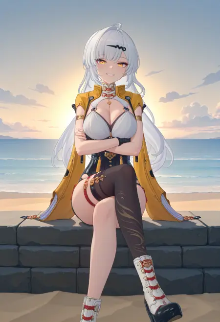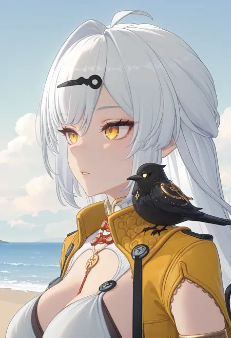 | 학습된 단어 | 1girl, Yixuan, solo, white hair, long hair, braid, ahoge, hair pin, yellow eyes, eyelashes, hair brooch,복사됨! yellow jacket, open jacket, short sleeves, gold armband, white top, cleavage, white collar, red laces, gold ornaments, black corset, yellow winged cape, black fingerless gloves, asymmetrical legwear, one thigh high, thigh strap, black and white boots,복사됨! |