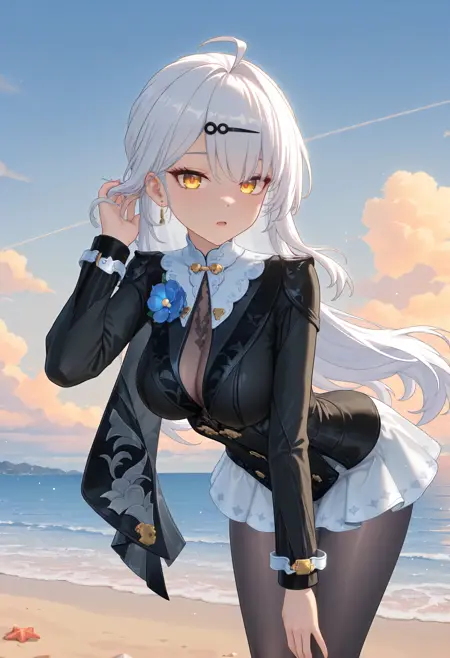 | 训练词汇 | 1girl, Yixuan, solo, white hair, long hair, braid, ahoge, hair pin, yellow eyes, eyelashes, hair brooch,已复制! black dress, dress pattern, gold ornaments, winged cape, white collar, sheer cleavage, blue flower on chest, white skirt, upskirt, pantyhose, black shoes,已复制! |