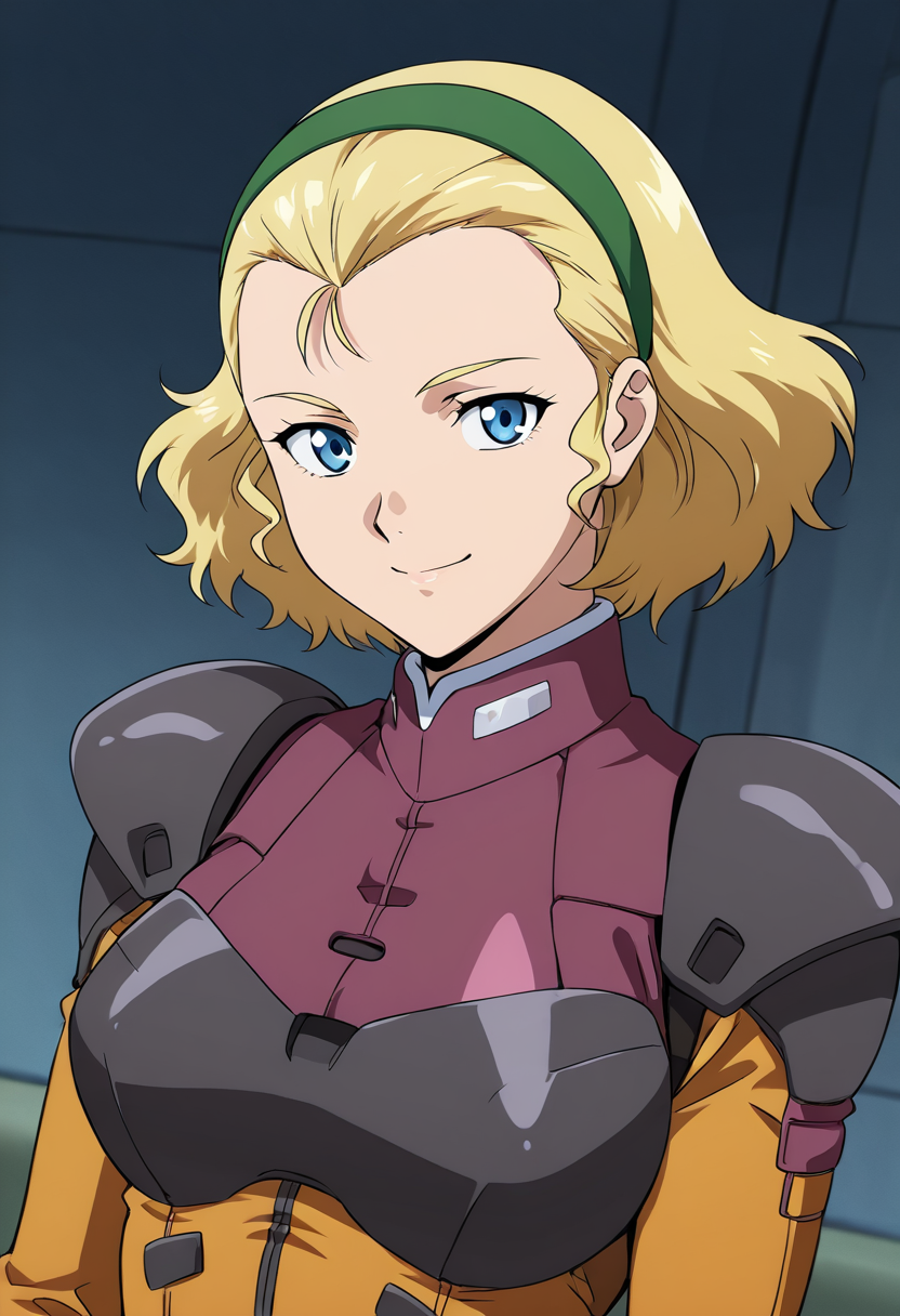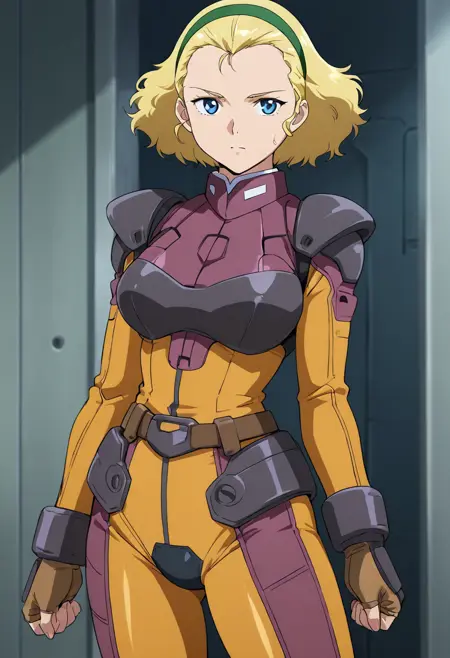 1girl, solo, LeilaRaymond, blonde hair, short hair, forehead, blue eyes, green hairband, bodysuit, anime coloring
