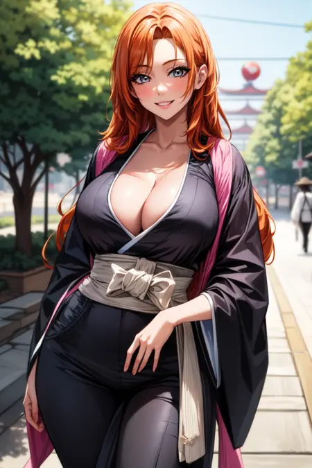 MatsumotoRangiku_NDV, 1girl, orange hair, large breasts, long hair, grey eyes, cleavage, japenese clothes, black kimono