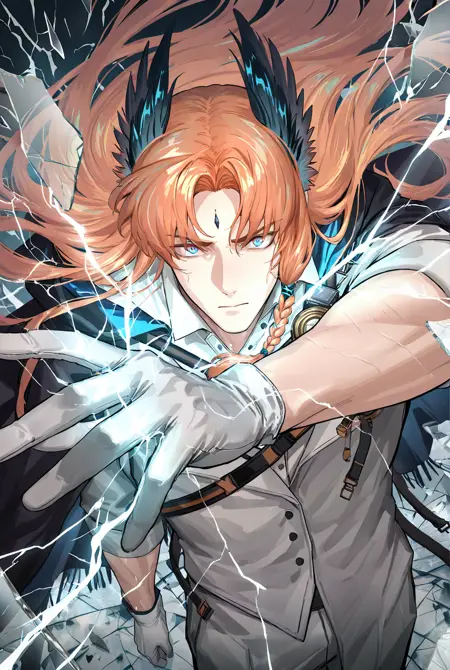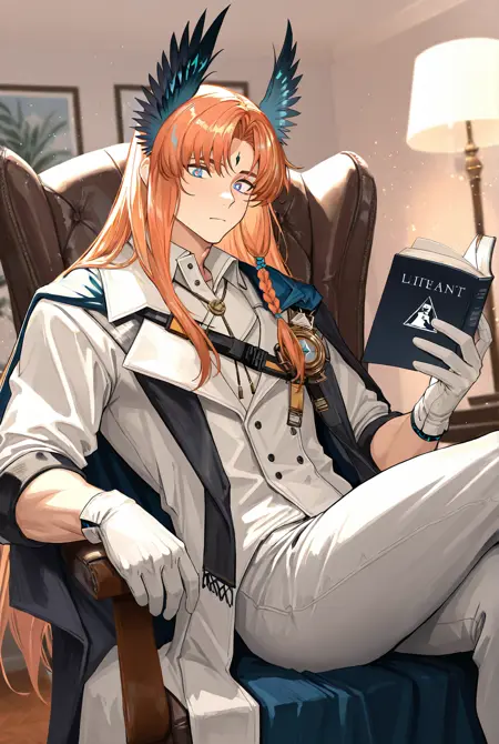 p4ssenger arknights, bara, long hair, head wings, braid, bangs, orange hair, blue eyes, gloves, white gloves, white shirt, shirt, jacket, coat, feather hair, cape