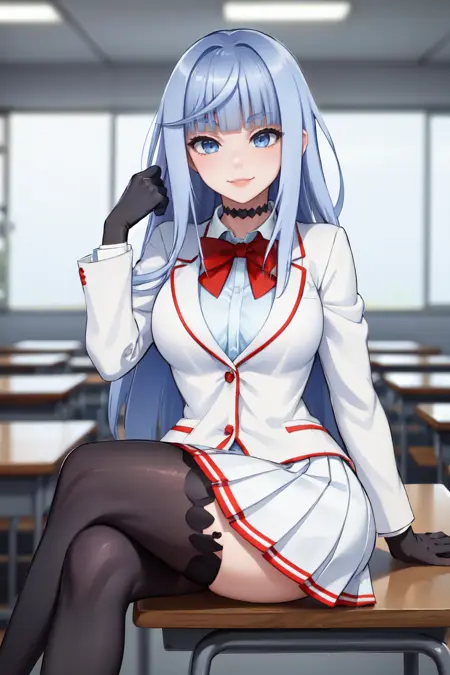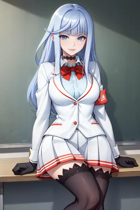 "school uniform, white jacket, armband, white skirt, bowtie, black gloves, black thighhighs, choker, thighhighs"