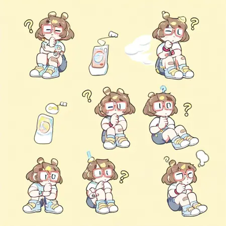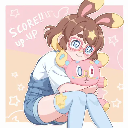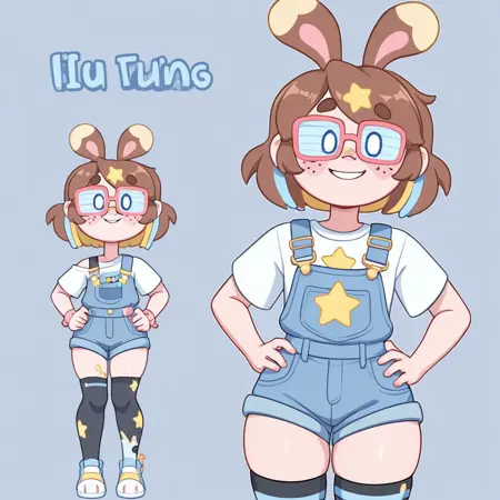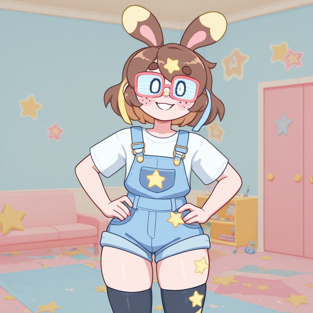 Raespark,1girl,solo,Short brown hair,White shirt,Glasses,Blue overall shorts,Star symbol,Freckles,Multicolored hair,Bunny ears, Blue eyes, Thigh-highs, chubby