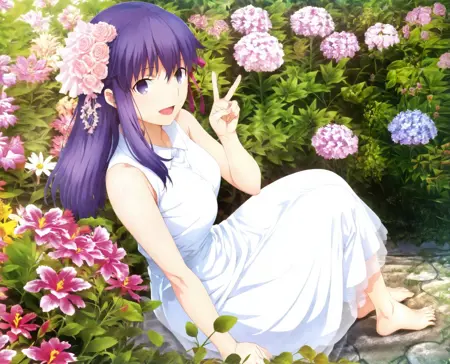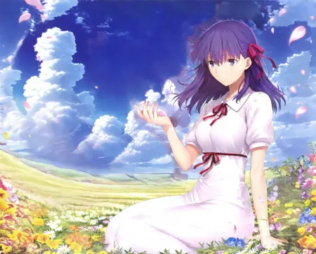 より詳細で、信じられないほど荒廃した解像度、壁紙、lora:sakura5464:1、1人の少女、東雲花園学園の制服、間桐桜、紫の目、リボン、紫の髪、横たわっている、スカート、赤いリボン、花びら、ピラーボックス、髪のリボン、白いシャツ、シャツ、首のリボン、長い髪、白い花、長袖、ベスト、黒いスカート、花畑、黄色い花、開いた唇、青い花、茶色のベスト、野原、手を自分のお腹に置く、ピンクの花、紫の花、デイジー、オレンジの花、目の間に髪、上から、ユリ(花)、