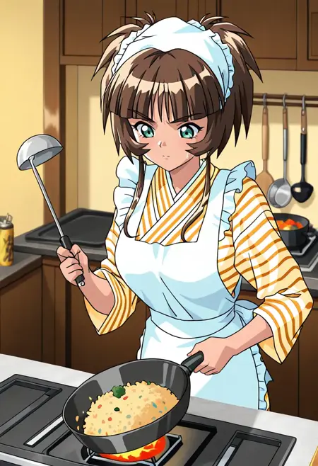 frilled apron, japanese clothes, white headscarf, yellow kimono,long sleeves, vertical-striped kimono, orange stripes, white apron, frilled head scarf