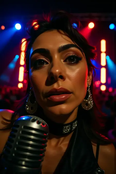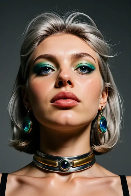 Use Her If You Want: • (fierce editorial stare:1.3) TO BE THE LAW! 👁️🗨️⚡ • Psychadelic colors, huge hair, and enough sequins to blind a Studio 54 bouncer. 😎 • The confident queen who confronts the camera head-on, ready for her close-up. 💪