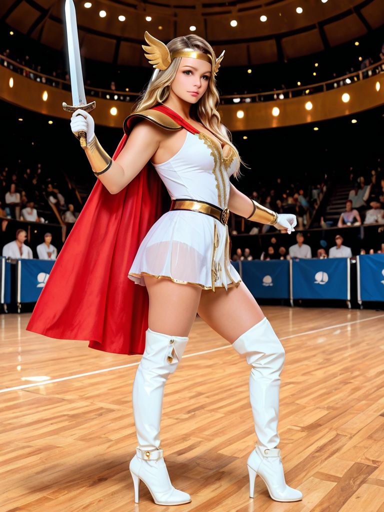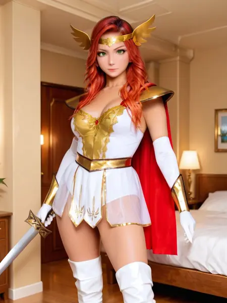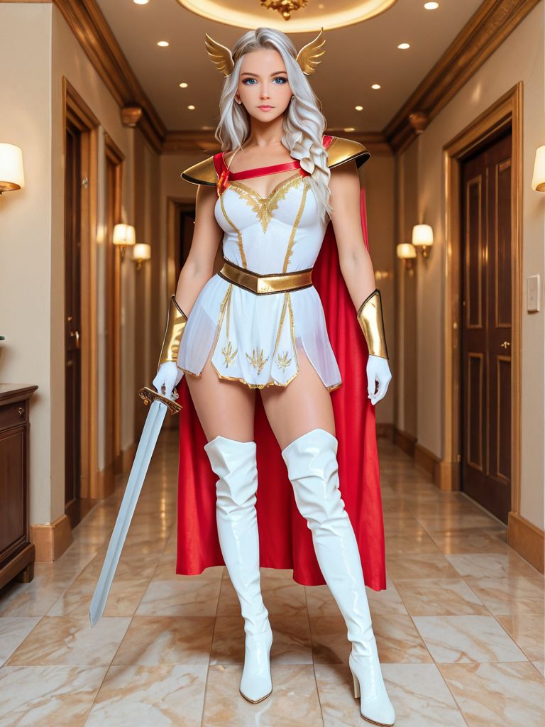 Sh3R4, white bodysuit, red cape, gold head wings, helmet, see-through, skirt, braid,