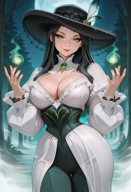 emmagrim, 1girl, breasts, solo, green eyes, large breasts, long hair, black hair,