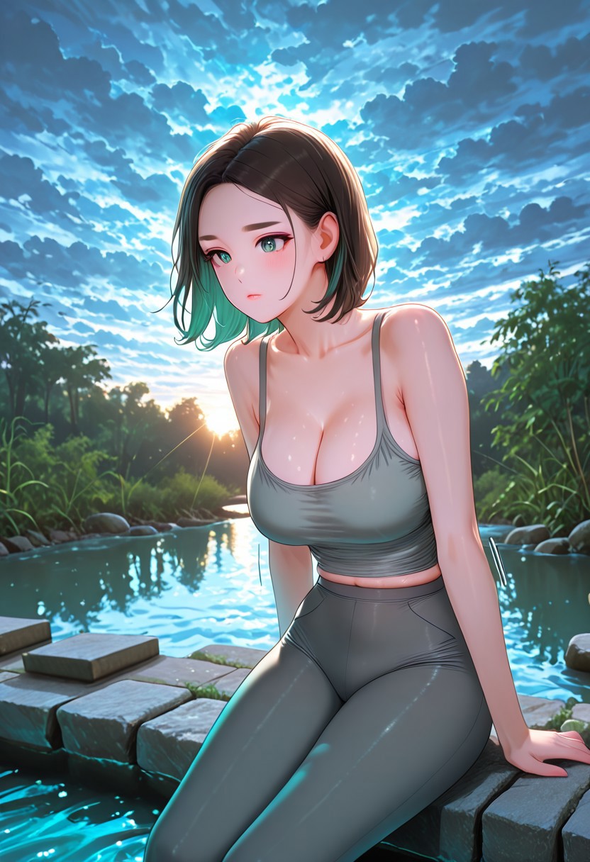 2. ((性感灰色吊带背心,暴露的乳沟,巨大的乳沟,灰色瑜伽裤,无胸罩,黑色运动鞋,白色鞋底,米色乳贴,)