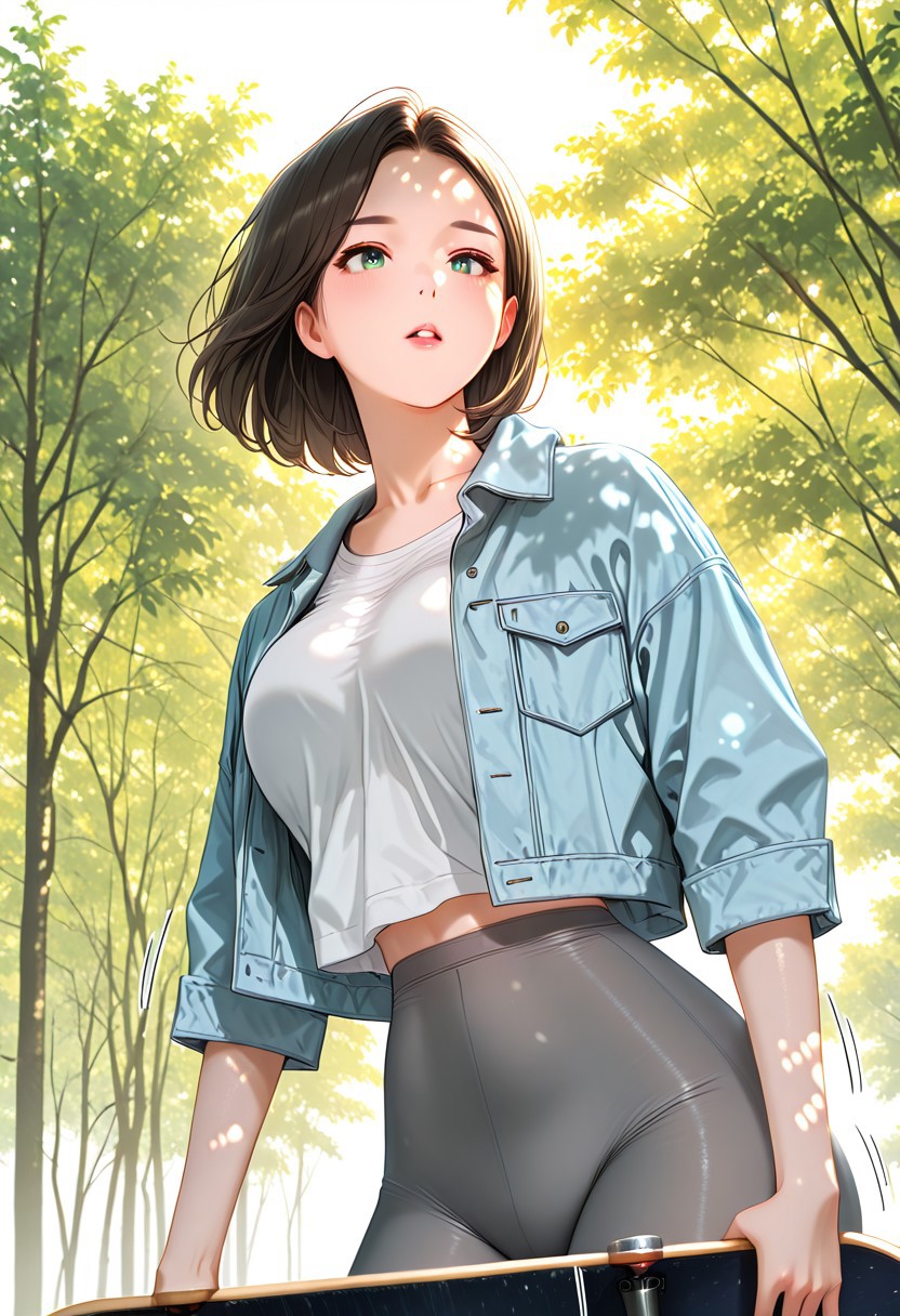 1. ((敞开的蓝色牛仔夹克,短袖白色上衣,灰色瑜伽裤,))黑色运动鞋,白色鞋底,