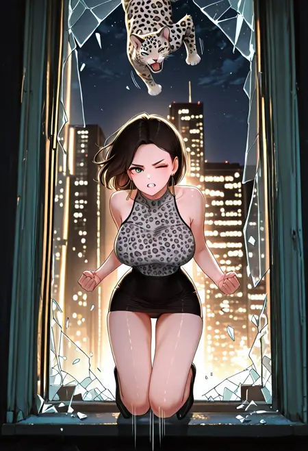 4. ((性感无袖高领灰色豹纹上衣,黑色镶边,长款金色耳环,性感黑色铅笔裙,))黑色靴子,黑色女士肩包,