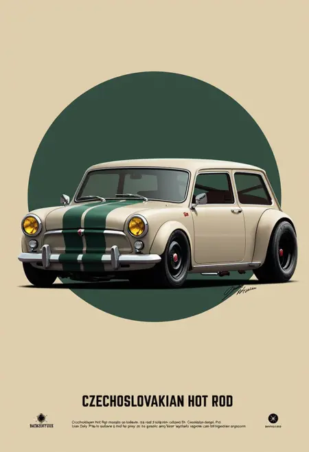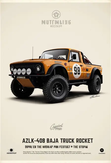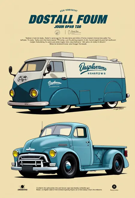 Bold illustrated poster aesthetics with large typography, flat or gradient backdrops, clean outlines, and high-contrast shading. Optimized for cars and trucks, but the look generalizes well to any subject—objects, characters, gadgets—rendered as a graphic cover or advertising poster.
