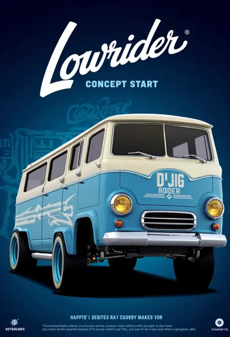 “Illustrated poster of a classic lowrider van, large headline typography, clean gradient background.”