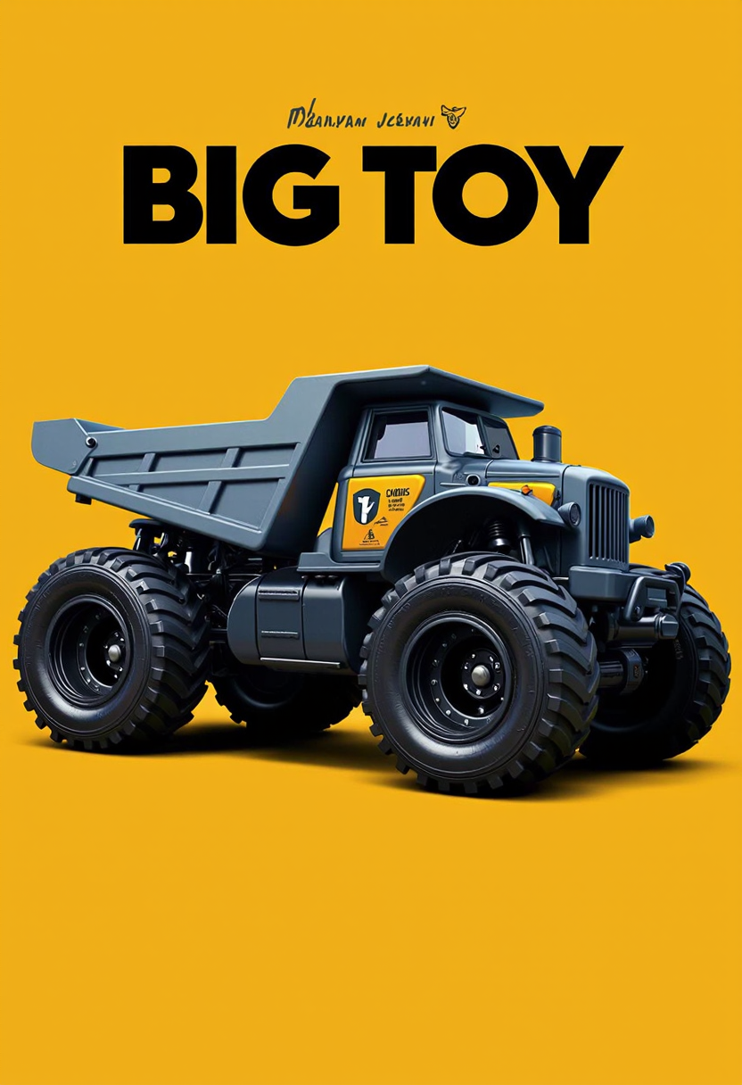 “BIG TOY dump truck poster, bold black lettering on mustard backdrop, graphic decal details.”