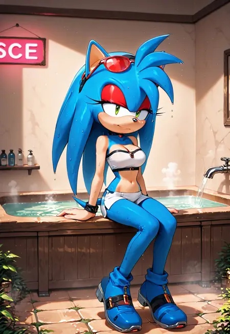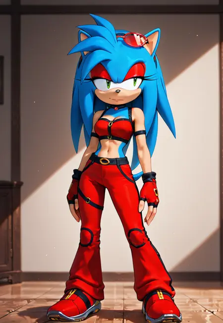 Apparance : anthro hedgehog, eyewear behind ears, source_sonic, blue fur, beige fur, black nose, red eyeshadow,