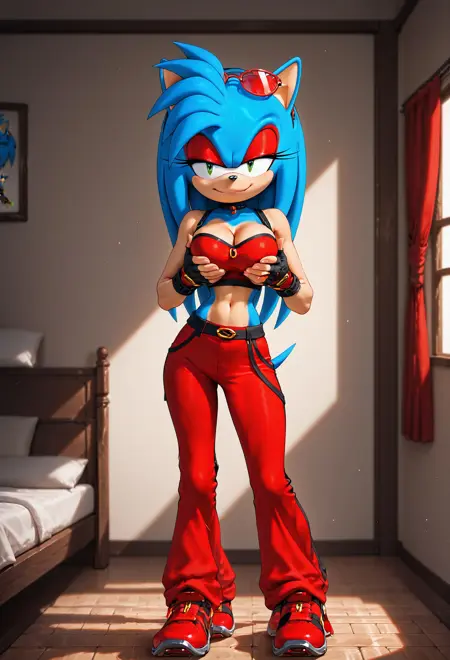 clothes : crop top, pants, fingerless gloves, red clothes, cleavage,