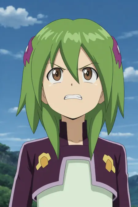 Patrick Sprigs, green hair, brown eyes, hair ornament