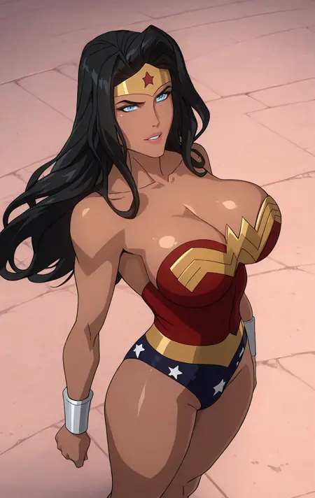 w0nd3r4, 1girl, long hair, looking at viewer, blue eyes, black hair, outdoors, dark skin, hairband, red lips, dark-skinned female,armlet,leotard