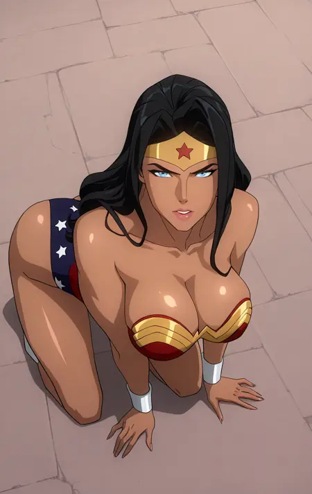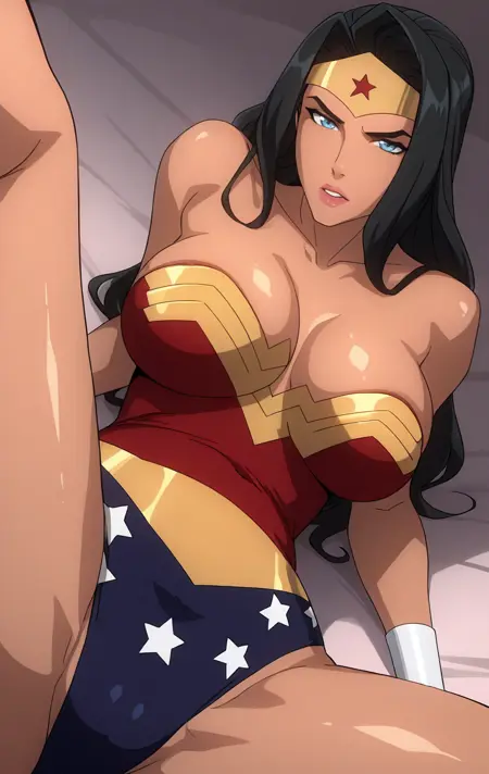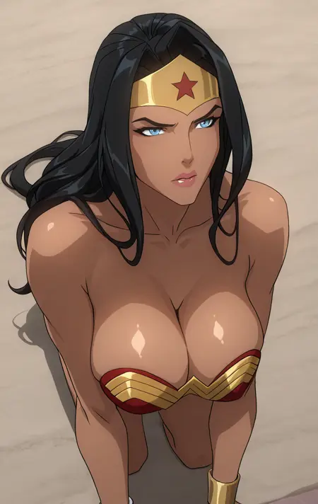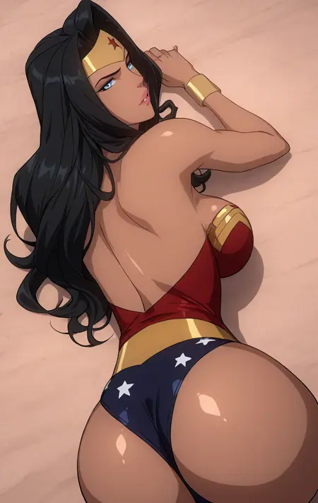 w0nd3r4, 1girl, long hair, blue eyes, black hair, dark skin, colored skin, hairband, star (symbol), dark-skinned female, star-shaped hairband,wristband,armlet,leotard,