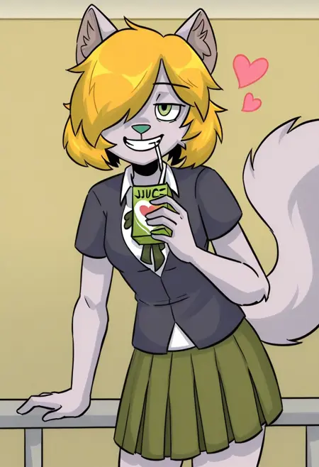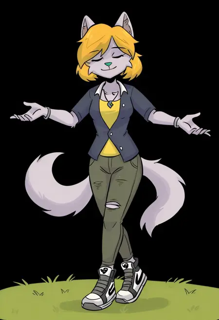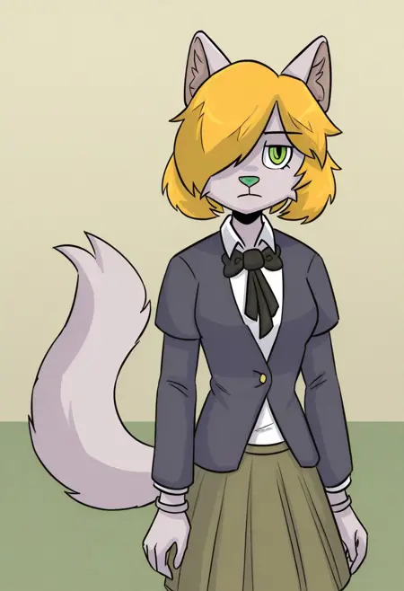 rn_gb、1girl、solo、ウルフガール、狼の耳、ファッリー、ファッリーフェメール、動物の耳、金髪、ショートヘア、緑の目、尾、狼の尾、片目に髪がかかる、