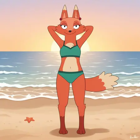 fox, fox girl, orange fur, black eyes, fox ears, black nose, fox tail, red ears piercings, Green collared shirt,