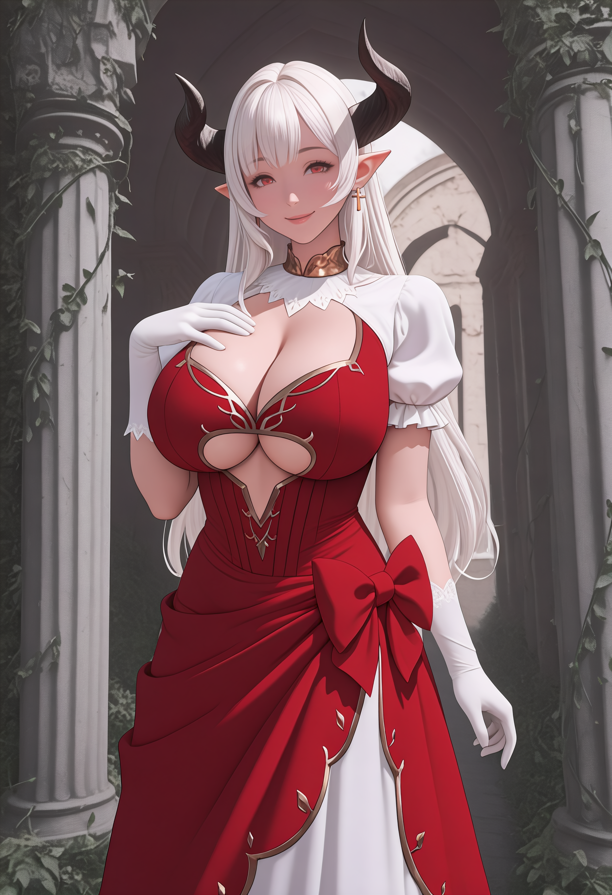 외모: 성숙한 여성, 긴 머리카락, 흰 머리카락, 뿔, 뾰족한 귀, 붉은 눈, 큰 가슴